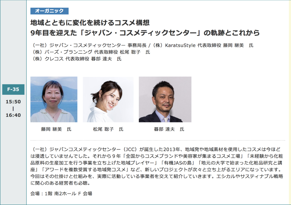 ひと・社会・地球の健康を考える。国内最大「健康」のビジネストレードショーが行われます。 JCCブースにて商品の展示が行われる他、【地域とともに変化を続けるコスメ構想】をテーマに登壇します。(10日/15:50-16:40) 登壇は事前申し込みが必要ですので、お近くの方は是非遊びにいらしてください。ぜひ。